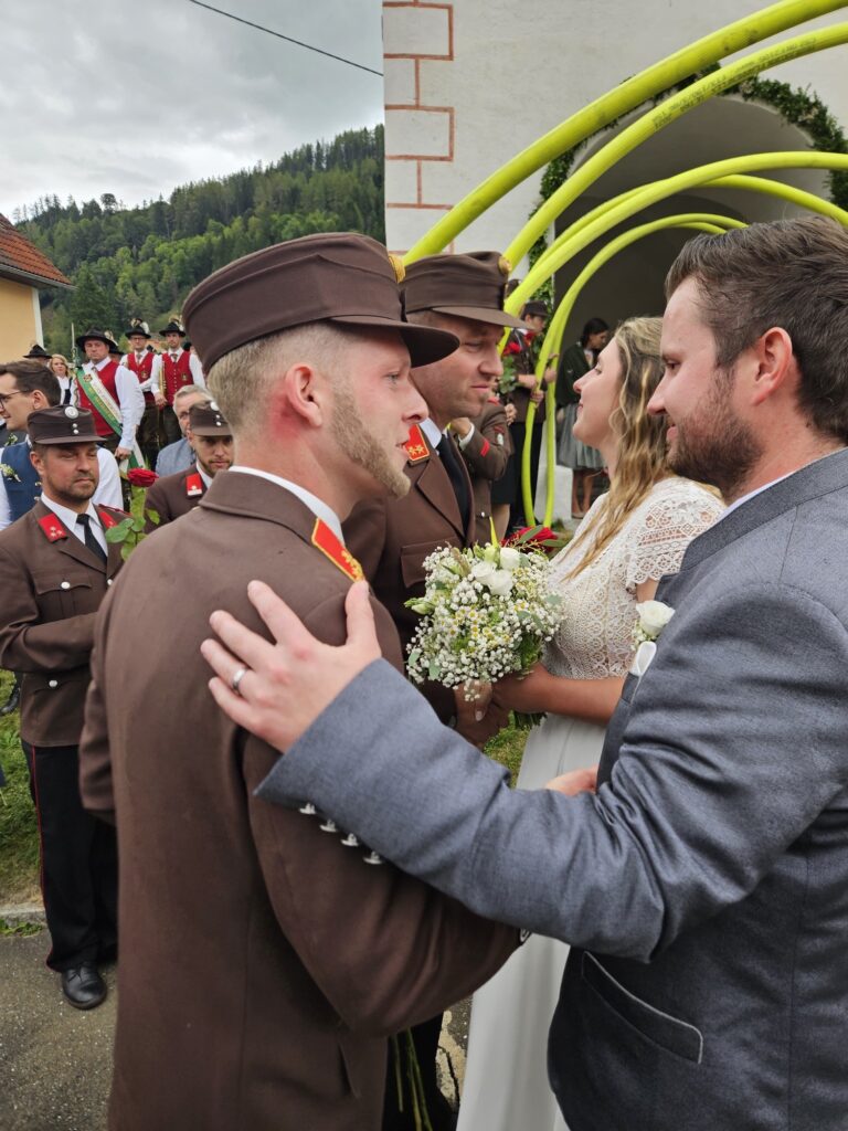 Bei traumhafter Kulisse haben wir das Brautpaar mit einem Spalier vor der Kirche überrascht, ehe wir unsere Gratulationen und Glückwünsche überbrachten