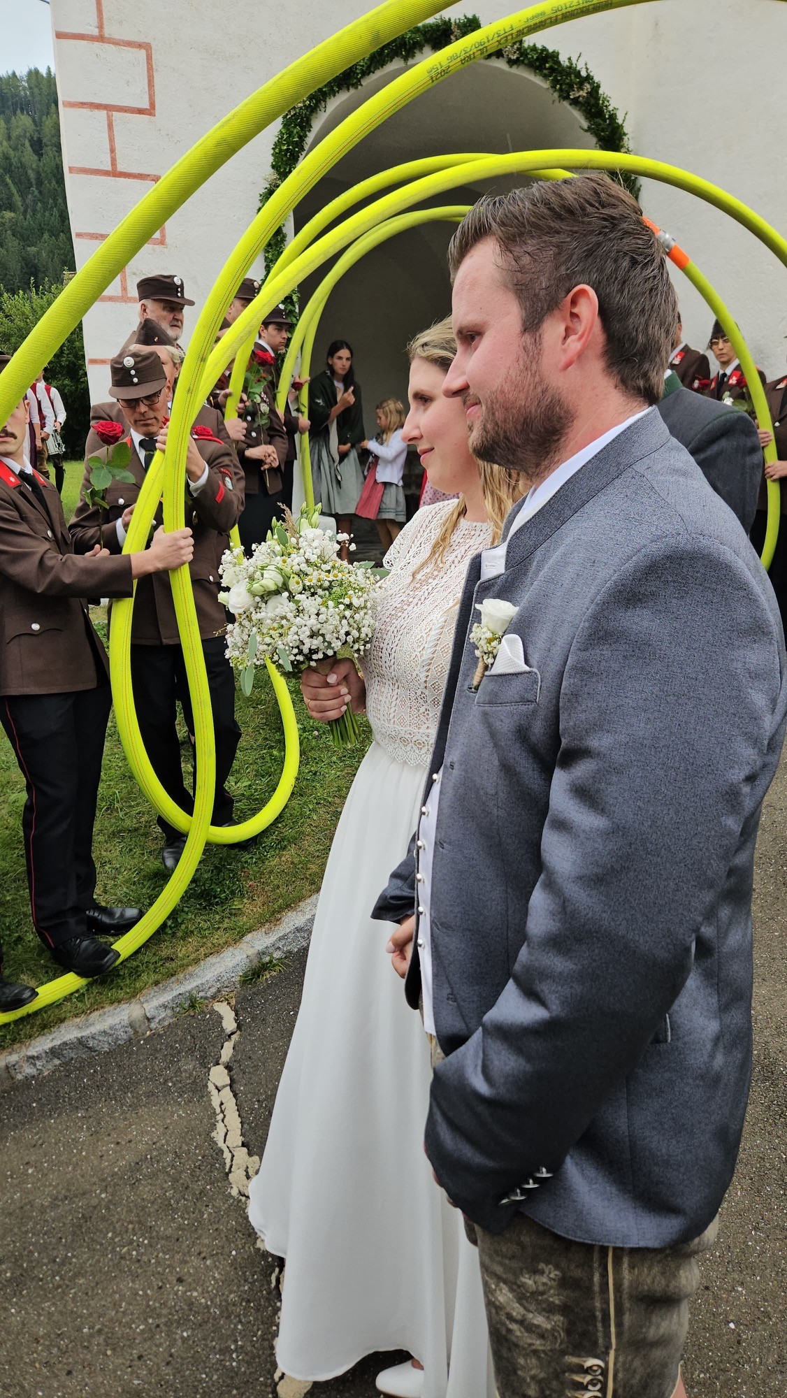 Bei traumhafter Kulisse haben wir das Brautpaar mit einem Spalier vor der Kirche überrascht, ehe wir unsere Gratulationen und Glückwünsche überbrachten